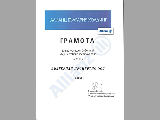 И тази година BULGARIAN PROPERTIES бяха отличени от водещата застрахователна компания Алианц България като „Най–успешен съветник по имуществени застраховки” за 2010 година. BULGARIAN PROPERTIES предлага на своите клиенти многообразие от застрахователни услуги, съчетани с високо ниво на обслужване.