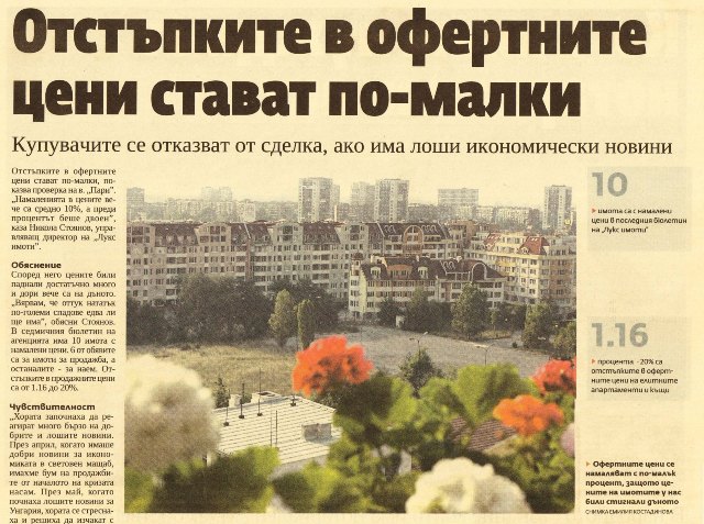 Отстъпките в офертните цени стават по-малки, показва проверка на в. „Пари". „Намаленията в цените вече са средно 10%, а преди процентът беше двоен", каза Никола Стоянов, управляващ директор на ЛУКС ИМОТИ.