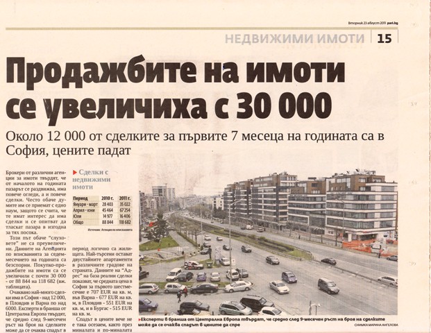 Брокери от различни агенции за имоти твърдят, че от началото на годината пазарът се раздвижва, има повече огледи, а и повече сделки. Често обаче думите им се приемат с едно наум, защото се счита, че те имат интерес да има сделки и се опитват да тласкат пазара в изгодна за тях посока. Този път обаче "слуховете" не са преувеличени. Данните на Агенцията по вписванията за седеммесечието на годината са безспорни. Покупко-продажбите на имоти са се увеличили с почти 30 000 - от 88 844 на 118 682. Очаквано най-много сделки има в София - над 12 000, в Пловдив и Варна по над 6000. Експерти в бранша от Централна Европа твърдят, че средно след 9-месечен ръст на броя на сделките може да се очаква спадът в цените да спре.