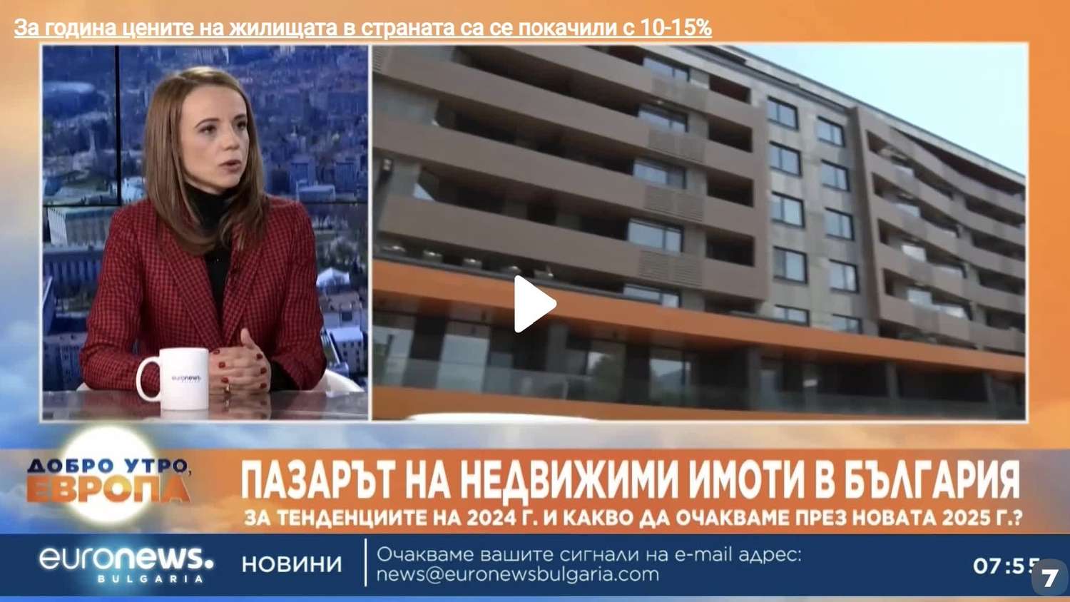 Ръст в цените на жилищата отчитат агенциите за недвижими имоти. В сравнение с миналата тази година увеличението е между 10 и 15% за страната и 18 на сто в София. Търсят се основно двустайни апартаменти ново строителство с цел инвестиции, коментира в ефира на „Добро утро, Европа“ по Euronews Bulgaria изпълнителният директор на агенция за недвижими имоти Полина Стойкова.