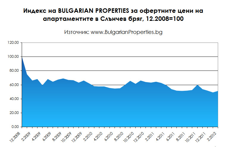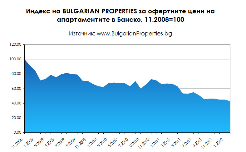 Индексите на BULGARIAN PROPERTIES за Слънчев бряг и Банско към 2.2012 г. са със стойности съответно 56 и 43 пункта при база 11.2008=100.