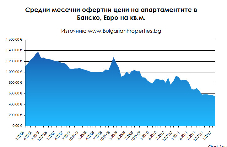 Средната офертна цена на апартаментите в Банско за февруари 2012 г. по данни на BULGARIAN PROPERTIES e 550 евро на кв.м., а цените започват от около 350 евро на кв.м. Това няма как да не привлече интерес на фона на активния зимен сезон, който тече в момента. През 2012 г. сделките в Банско се сключват на около 450 евро на кв.м.