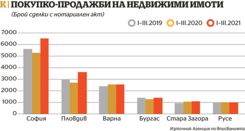 Ръст в броя на сделките има в пет от шестте големи града по данни на Агенцията по вписванията, но той е доста различен. Спрямо 2019 г. най-голям е той в Пловдив - 20.4%, следван от този в София от 16% и в Стара Загора - 13.6%. Във Варна нарастването е 5.75%, а в Бургас - 1.4%, докато в Русе има спад от 0.8%. Наблюдатели отбелязват, че градове във вътрешността на страната като София, Пловдив и Стара Загора привличат хора заради възможността за работа, а достъпността до банково кредитиране създава клиенти на пазара на недвижими имоти в тях. В същото време градовете по границите като Русе, Бургас и Варна по-скоро генерират мигранти към по-големите градове.
