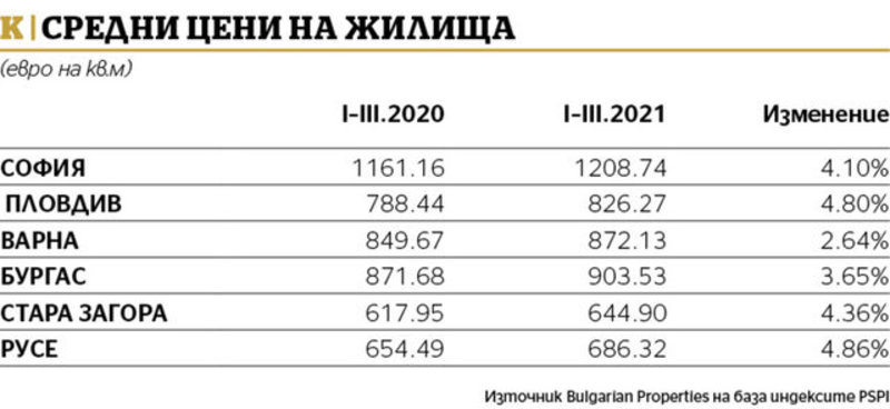 Bulgarian Properties отчита ръст на новите сключени сделки за София около 20% през първо тримесечие на 2021 спрямо същия период на 2020 г. Спрямо 2019 г. той е около 8%. Изпълнителният директор на компанията Полина Стойкова отбелязва фактор, който вероятно води до статистически ръст, по-голям от реалния. "В началото на годината бяха въведени в експлоатация цели нови сгради. В момента се изповядват вече сключени сделки за апартаменти в тях на зелено. Има сгради и с по 300 апартамента, а когато става дума за няколко подобни, това чувствително влияе върху статистиката", обяснява тя.