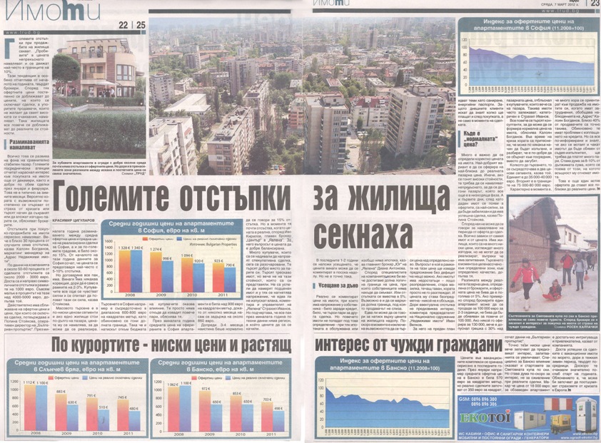 Всичко това се развива на фона на сравнително стабилен пазар. Големите посреднически агенции отчитат нараснал интерес към покупката на имоти още от декември, както и добри по обем сделки през януари и февруари. Това не е типично за зимните месеци. Вероятно хората с възможности постепенно се отърсват от страха от кризата или търсят начин да съхранят или да вложат изгодно парите си, обясняват брокерите.