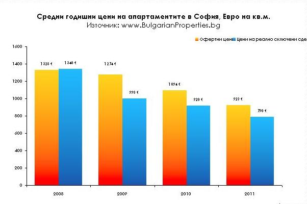 През миналата година средната цена на оферираните в София апартаменти е била над 900 евро на квадратен метър, докато от няколко месеца насам се задържа на около 860 евро.