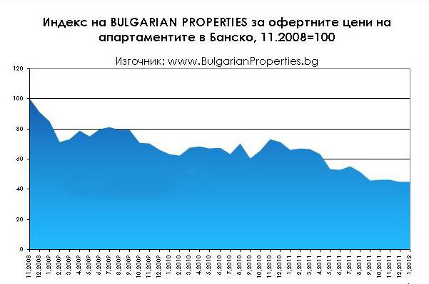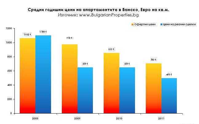 Цените във ваканционните комплекси се сринаха сериозно в последните години. През януари например средната офертна цена в Банско е била 570 евро за квадратен метър, но реално сделките започват от 350 евро за квадрат, сочат данни на „Бългериан Пропертис".
