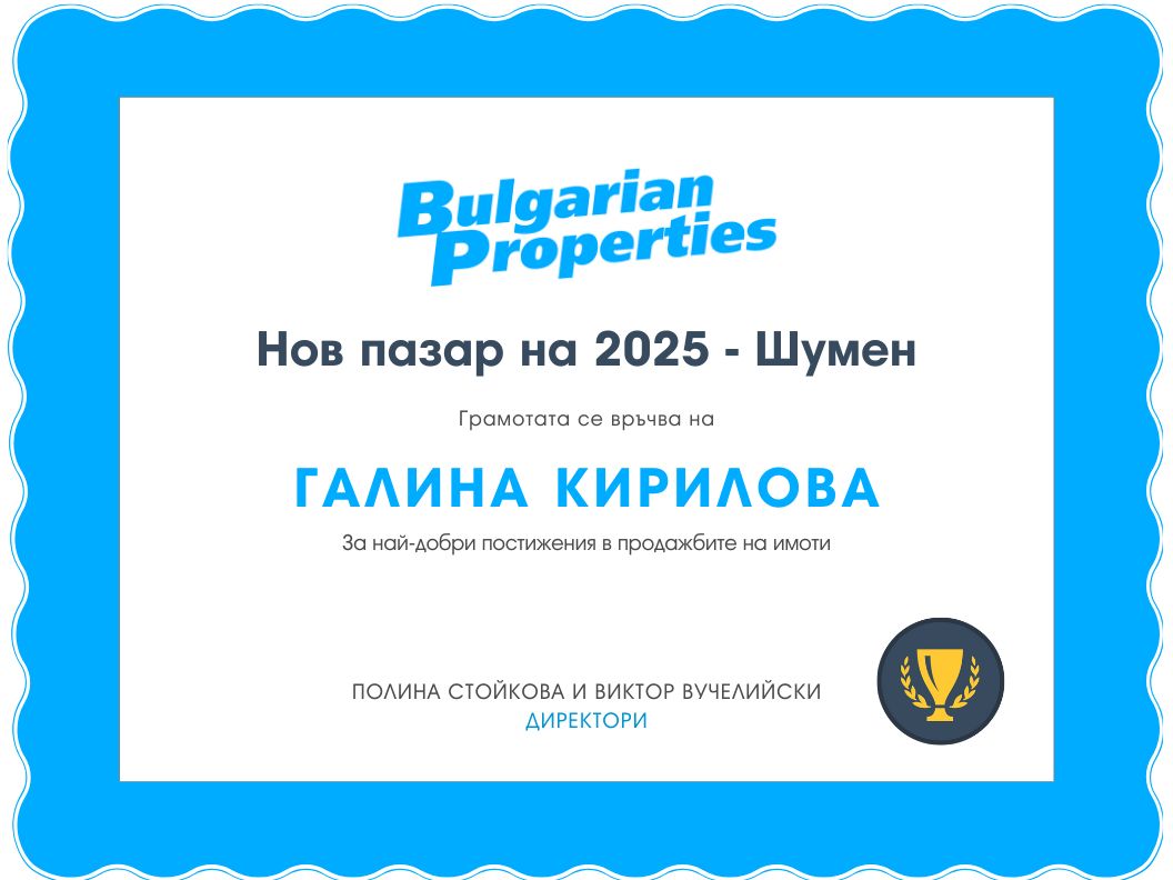 Като част от екипа на BULGARIAN PROPERTIES, тя съчетава опит, професионализъм и лично отношение към всеки клиент, като предлага надеждно съдействие при покупка, продажба и оценка на имоти.