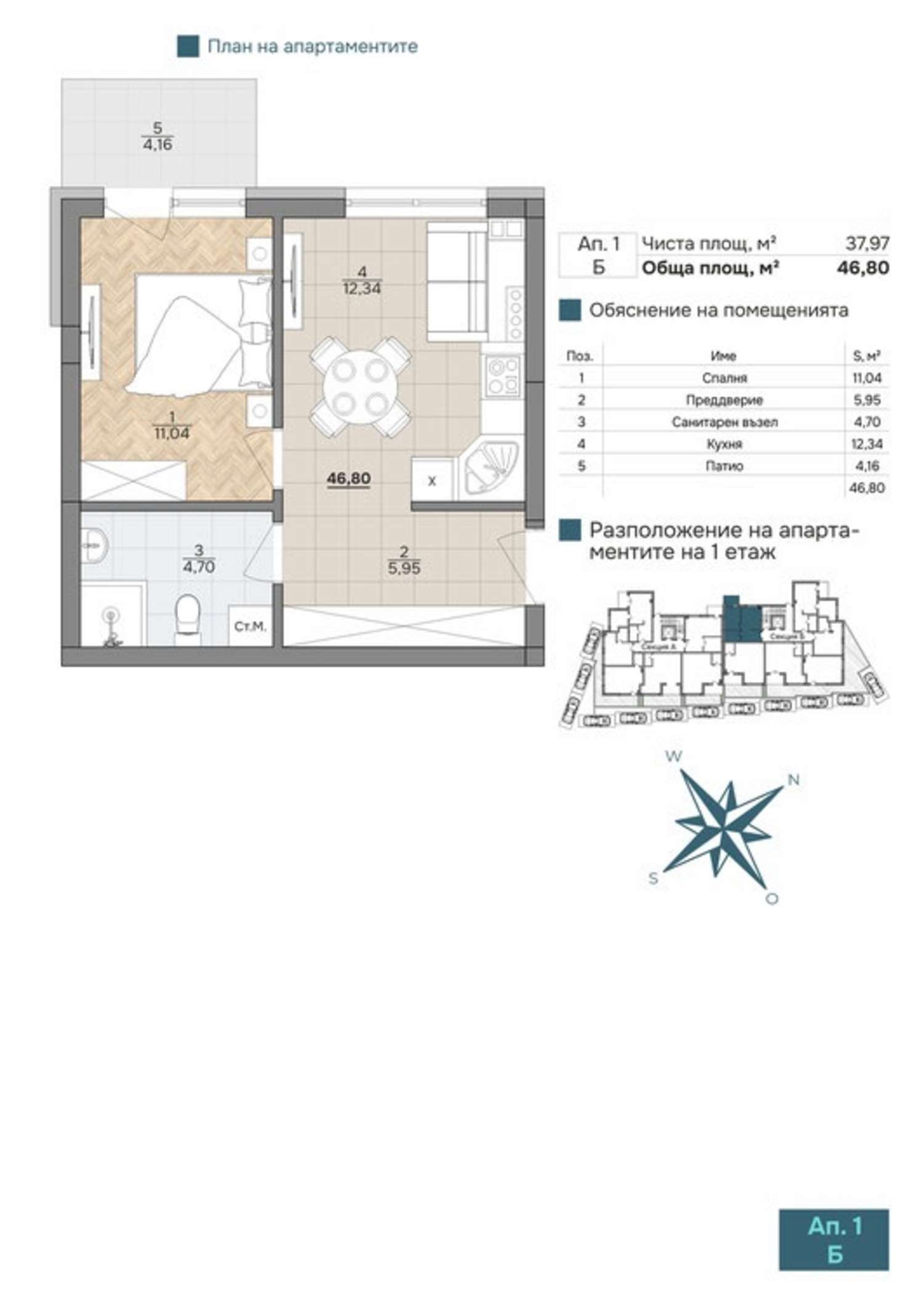 (1 850 €/м2) (3 618,29 лв./м2)Площ: 46.80 м2 Етаж: 1