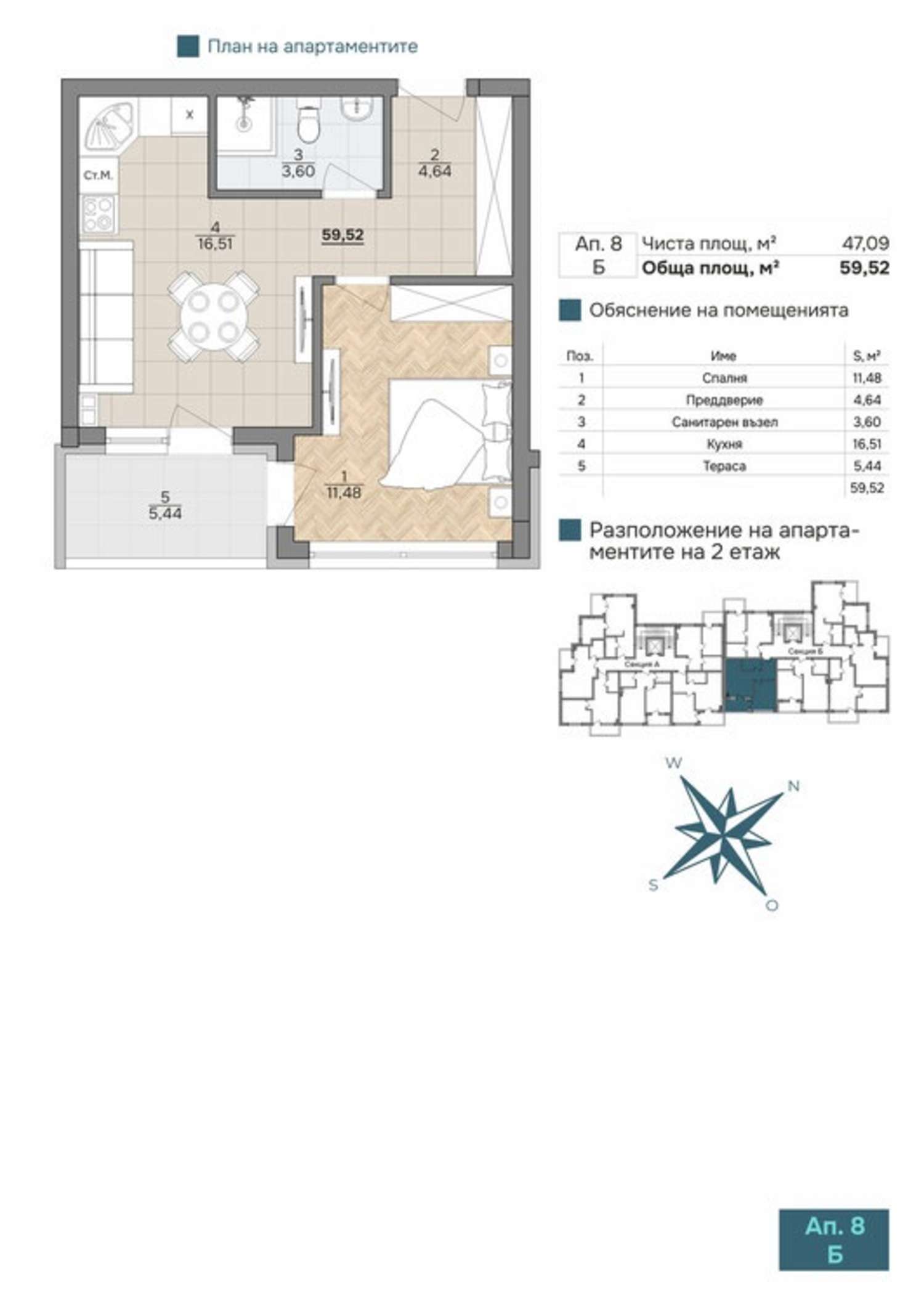 (1 749 €/м2) (3 420,75 лв./м2)Площ: 59.52 м2 Етаж: 2