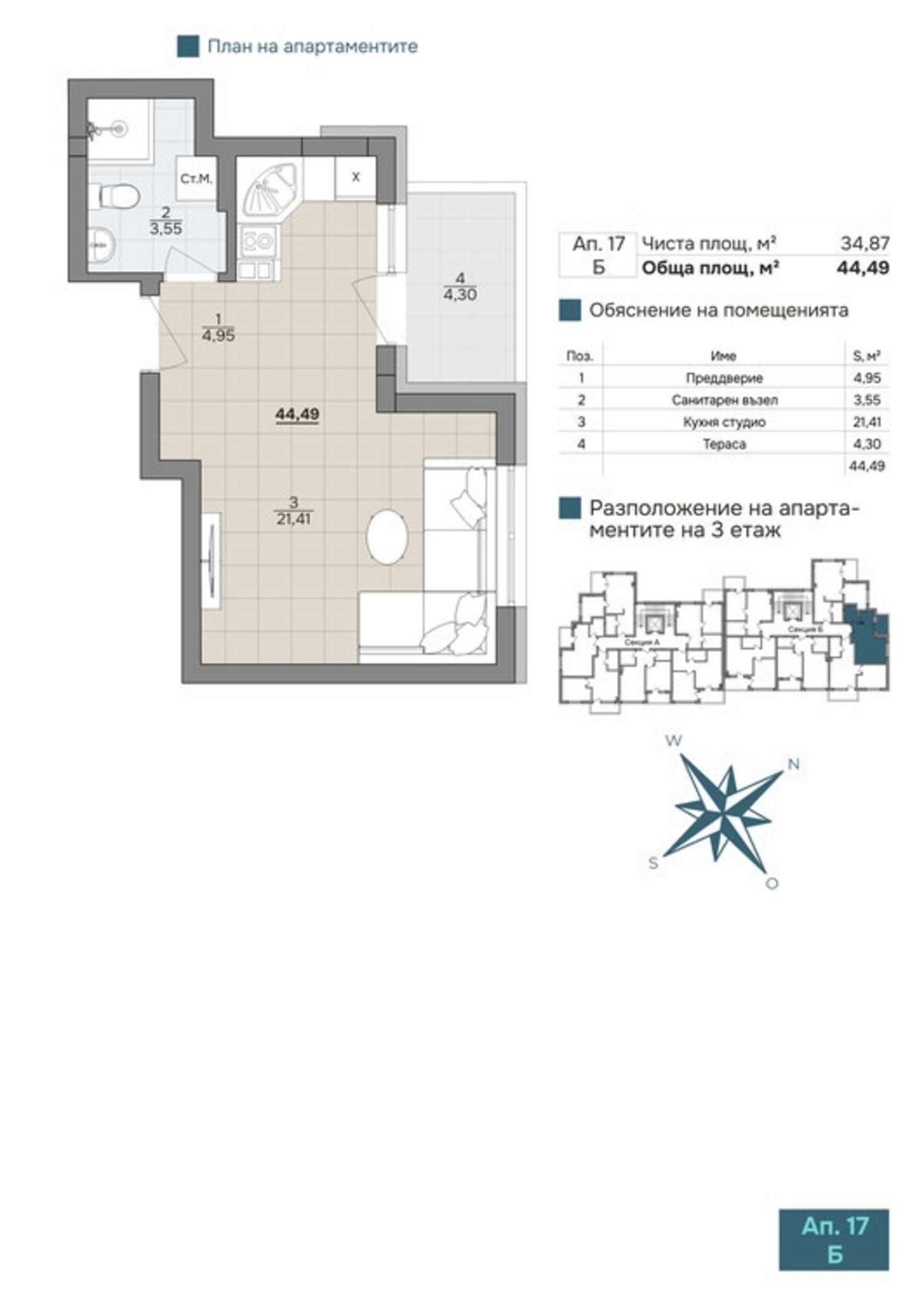 (1 749 €/м2) (3 420,75 лв./м2)Площ: 44.49 м2 Етаж: 3