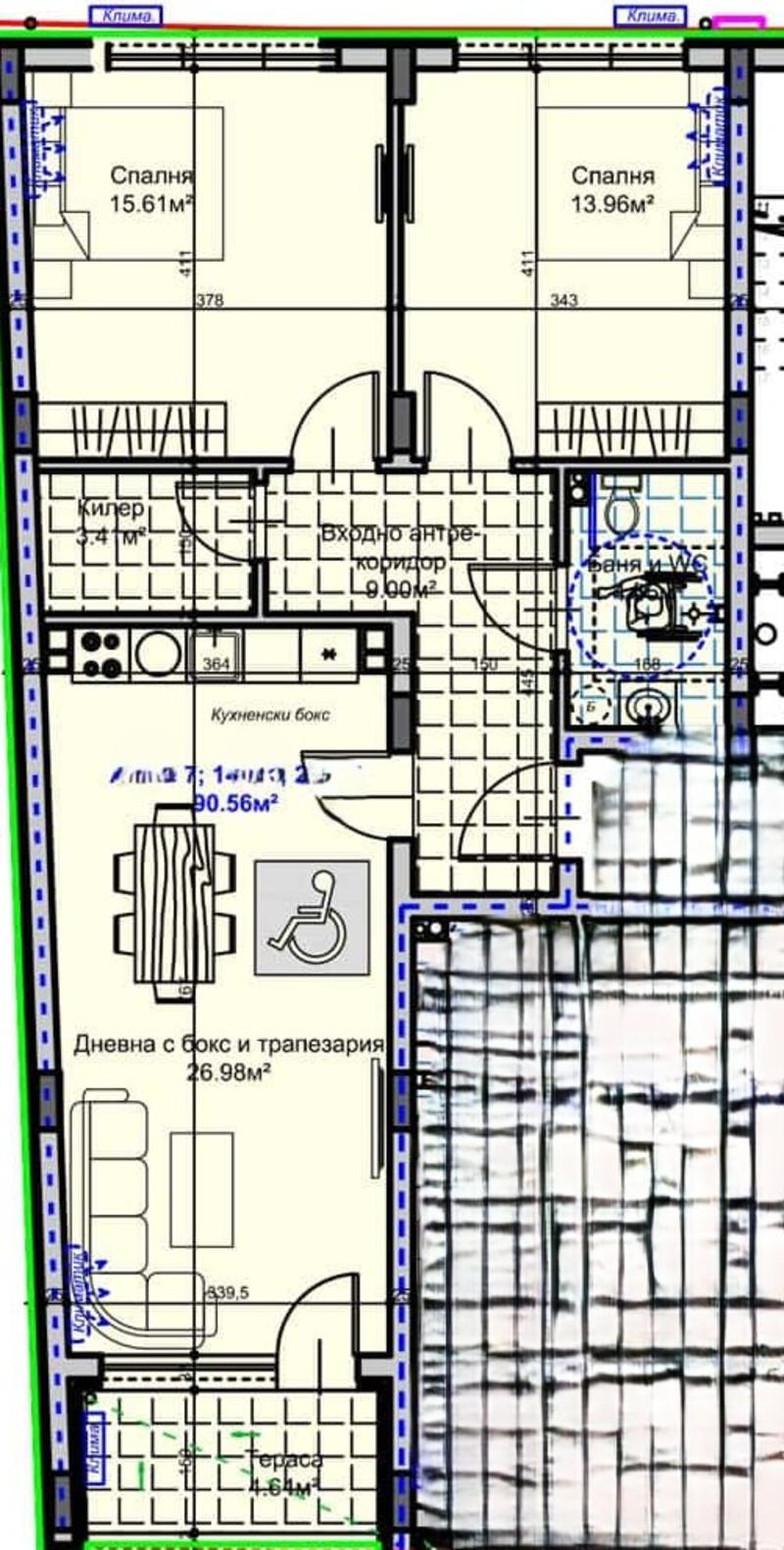Апартаментът е с площ 67,39 кв.м и се