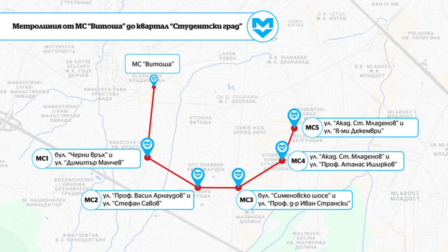 Подробният устройствен план (ПУП) за метро до "Студентски град" беше одобрен през 2023 г., като идеята е то да започва с една станция при бул. "Черни връх", после да пресича "Симеоновско шосе" и да продължава до "Студентски град". Предвижда се станциите да са разположени на следните локации: