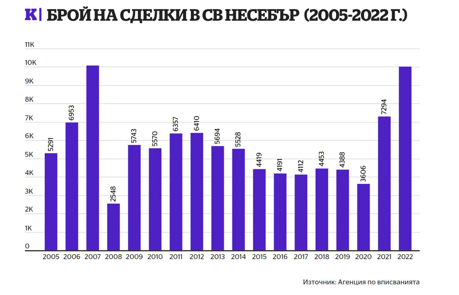 По броя на сделките през 2022 г. СВ - Несебър, измества големи областни градове като Бургас, Русе, Стара Загора, като се нарежда веднага след София, Пловдив и Варна. И докато през 2007 г. рекорден брой сделки се наблюдава в цялата страна, през 2022 г. общата картинка е със спад малко повече от 2%, докато службата в морския град бележи най-високия ръст.