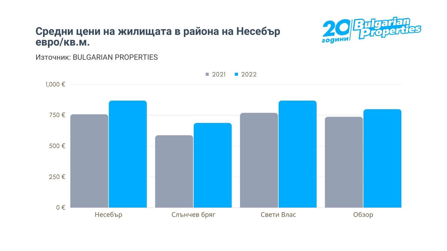 По данни на BULGARIAN PROPERTIES средните цени в Несебър и Свети Влас са около 860 евро, в Обзор около 800, а в Слънчев бряг 700 евро.