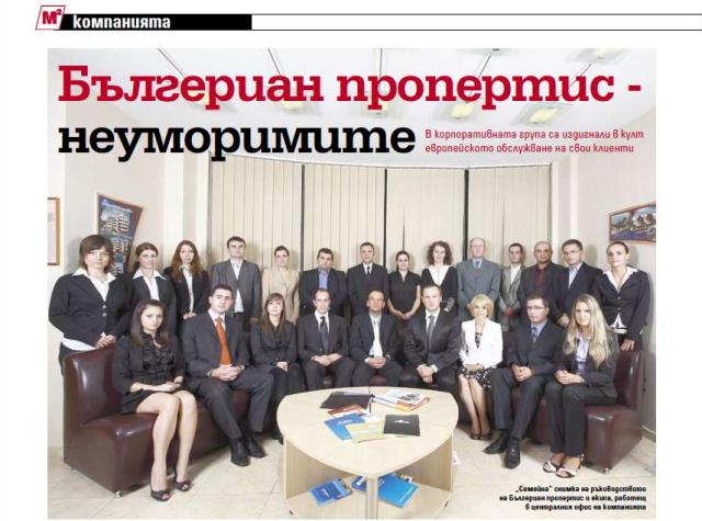 Само през тази година специалистите от компанията ни са подготвили над 20 анализа на пазара на недвижими имоти в различните му сегменти. Цитирани сме в над 200 публикации в медиите. Още от 2003-2004 година ни търсят активно и от чуждестранни списания и вестници, в които се пише за българския имотен пазар”, обяснява Полина спецификата на работата в Бългериан Пропертис. И представя част от екипа: Галя Златанова се занимава с ипотеките и застраховките на имотите, а Силвия Митрова и Магдалена Тошева контролират целия процес по управление на вътрешните бази данни за имотите - нотариални заверки, прехвърляния, комуникация с клиентите при разсрочени плащания, преговори със строителите и т.н. Въпреки младостта си, момичетата работят в компанията от близо 5 години. Някои са дошли по приятелска линия, други - по обява.