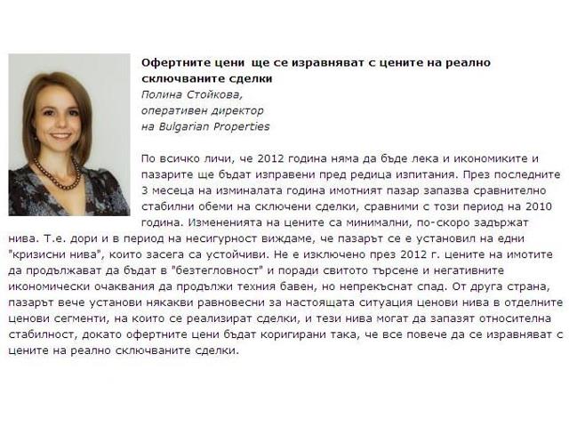 По всичко личи, че 2012 година няма да бъде лека и икономиките и пазарите ще бъдат изправени пред редица изпитания. През последните 3 месеца на изминалата година имотният пазар запазва сравнително стабилни обеми на сключени сделки, сравними с този период на 2010 година. Измененията на цените са минимални, по-скоро задържат нива. Т.е. дори и в период на несигурност виждаме, че пазарът се е установил на едни "кризисни нива", които засега са устойчиви. Не е изключено през 2012 г. цените на имотите да продължават да бъдат в "безтегловност" и поради свитото търсене и негативните икономически очаквания да продължи техния бавен, но непрекъснат спад. От друга страна, пазарът вече установи някакви равновесни за настоящата ситуация ценови нива в отделните ценови сегменти, на които се реализират сделки, и тези нива могат да запазят относителна стабилност, докато офертните цени бъдат коригирани така, че все повече да се изравняват с цените на реално сключваните сделки.