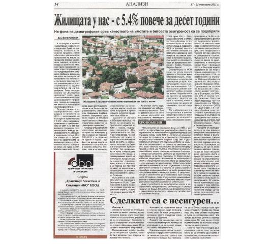 Според данните от преброяването, проведено в началото на 2011 г., населението на България е намаляло със 7%, а броят на жилищата в страната е нараснал с 5.4%. „Ако направим сравнение с преброяването от 2001 г. (3 688 802 жилища), проличава разминаването между демографските тенденции и жилищния пазар. Все пак следва да се отбележи и че нарастването на жилищния фонд е сравнително малък процент на фона на бума, който изживя имотният пазар през изминалото десетилетие и на базата на нарастванията, измерени при предишни преброявания. Например през 90-те години на миналия век броят на жилищата е нараснал с 20%“, коментира Полина Стойкова, оперативен директор на „Бългериан пропертис“.