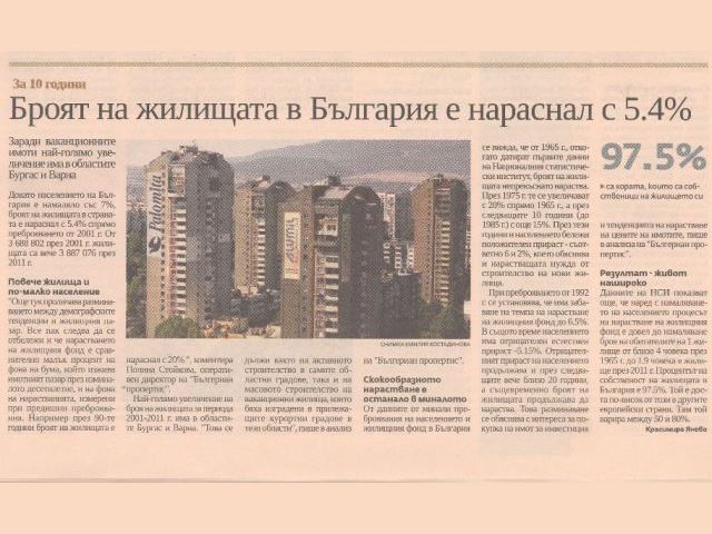 “Още тук проличава разминаването между демографските тенденции и жилищния пазар. Все пак следва да се отбележи и че нарастването на жилищния фонд е сравнително малък процент на фона на бума, който изживя имотният пазар през изминалото десетилетие, и на фона на нарастванията, измерени при предишни преброявания. Например през 90-те години броят на жилищата е нараснал с 20%”, коментира Полина Стойкова, оперативен директор на Бългериан Пропертис. Най-голямо увеличение на броя на жилищата за периода 2001-2011 г. има в областите Бургас и Варна. "Това се дължи както на активното строителство в самите областни градове, така и на масовото строителство на ваканционни жилища, които бяха изградени в прилежащите курортни градове в тези области", пише в анализ на Бългериан Пропертис.